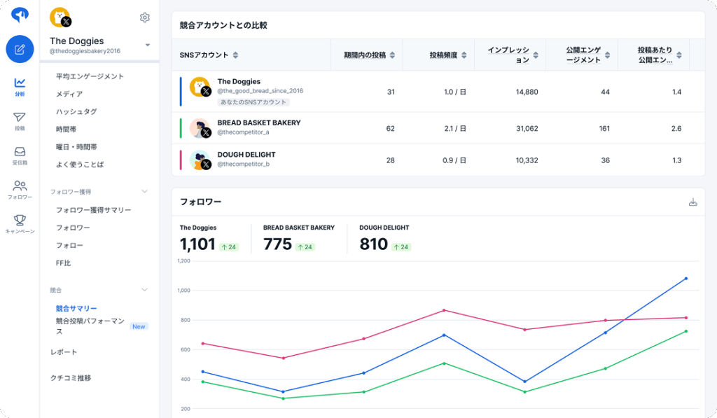 - 競合アカウントの投稿内容や反応を分析し、効果的な戦略立案に活用