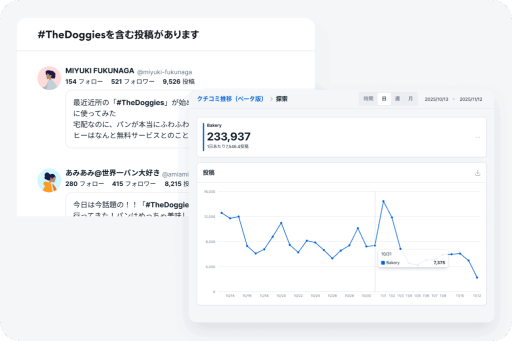 - 指定のキーワードを含むクチコミ数の推移を可視化し、トレンドを把握