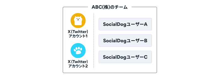 チーム・SocialDogアカウント・SNSアカウントの関係は以下のとおりです。