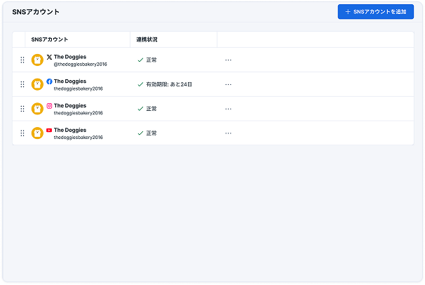 SocialDogでは、SNSアカウントを複数連携して一元管理できます。たとえば、企業の公式アカウントとブランドごとのアカウントなど、複数のアカウントを切り替えながら運用する場合に便利です。