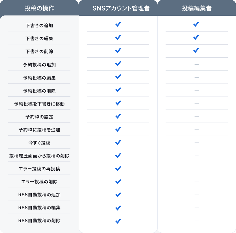 - SNSアカウント管理者:すべての投稿操作が可能です。