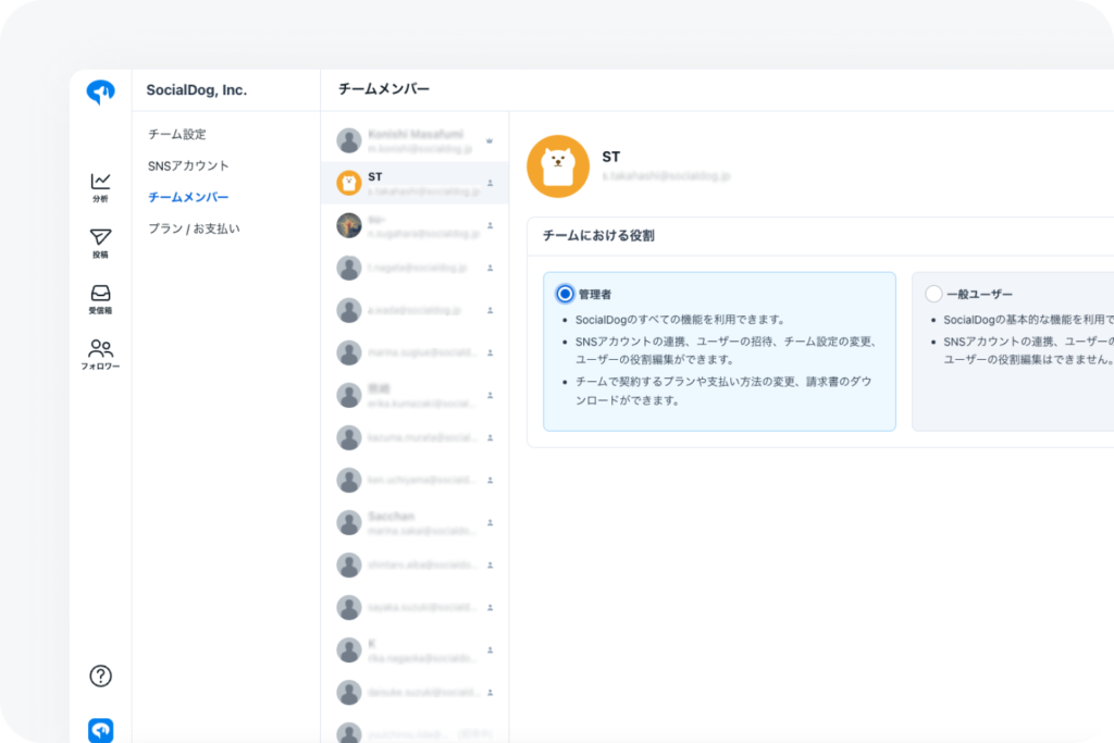 - チームに所属しているユーザー(SocialDogアカウント)は、そのチームに連携されているSNSアカウントの運用(投稿、分析、フォロワー管理など)ができます。