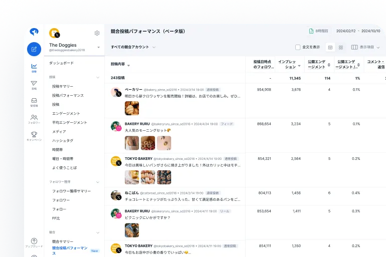 自社と競合アカウントの投稿・フォロワー・エンゲージメントを比較し、競合の投稿内容や反応を分析することで、戦略に活かせます。