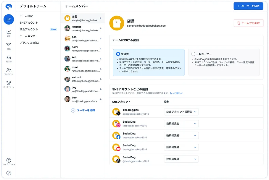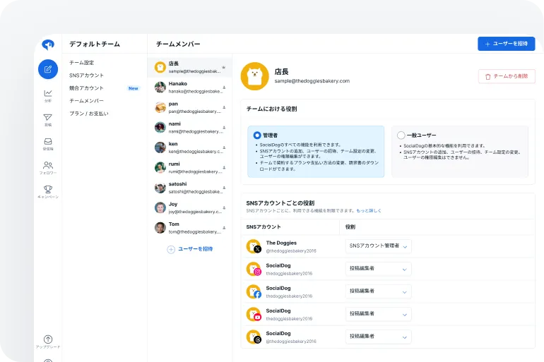 共通のSNSアカウントを複数のユーザーで管理でき、チーム内での投稿やレポート作成を効率的に進められます。