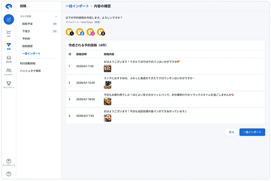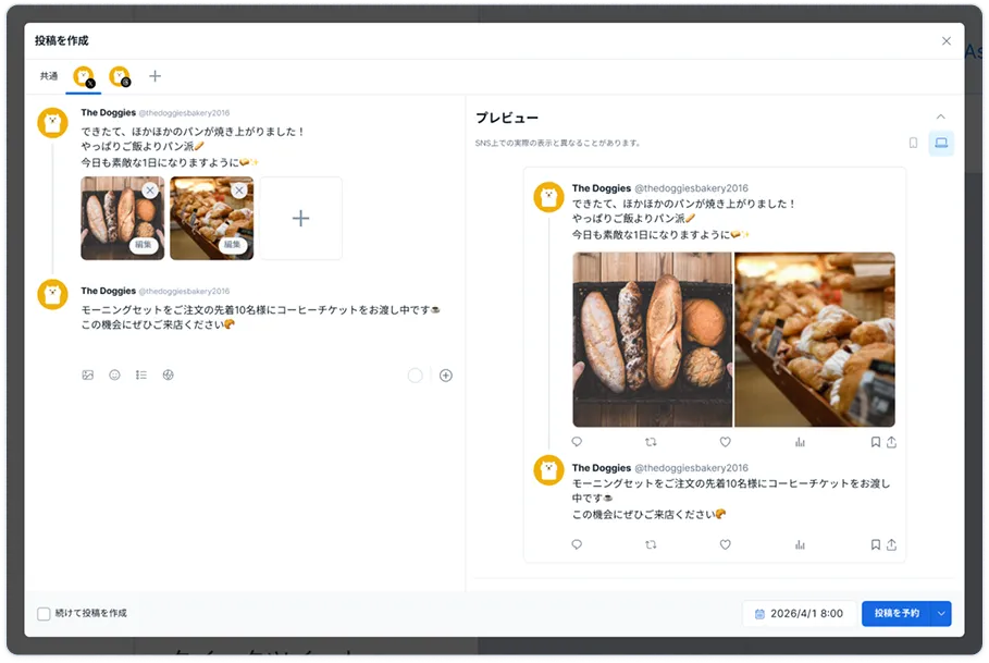さまざまな形式での予約投稿やAIによる投稿生成に加え、投稿の効果を最大化する高度な分析機能も備えています。
