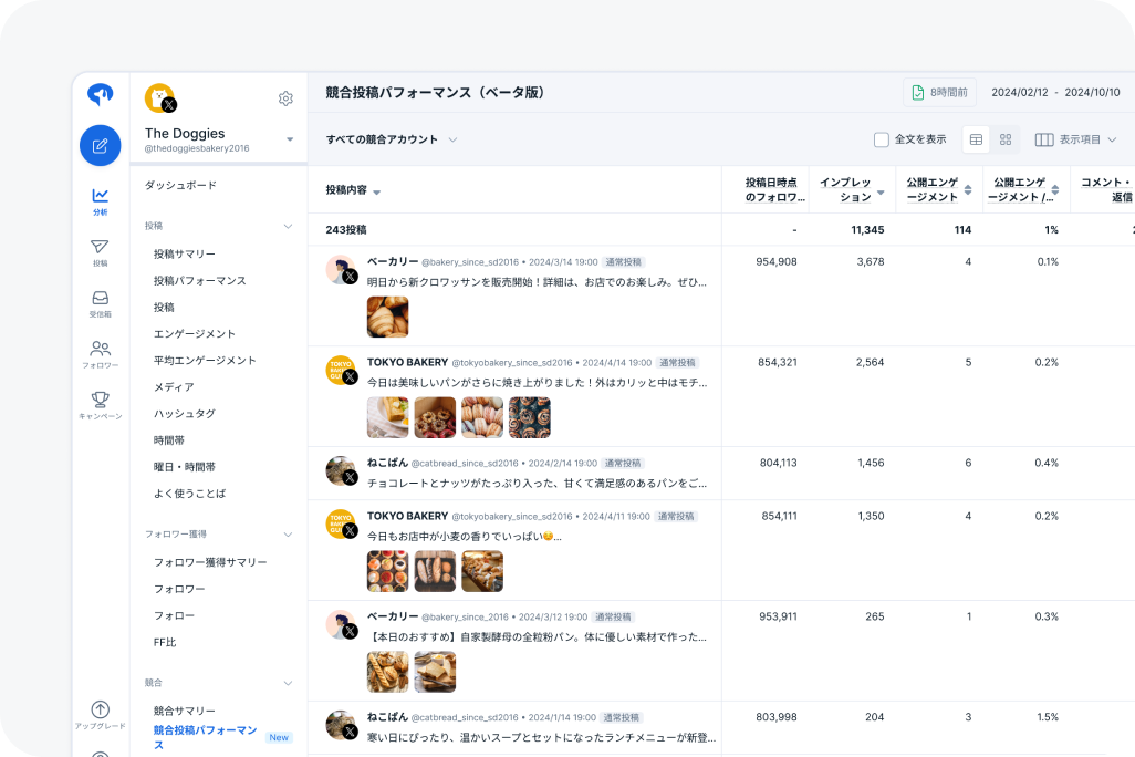 他社アカウントの投稿内容・インプレッション・エンゲージメントを比較し、反応の高い投稿やトレンドを把握できます。