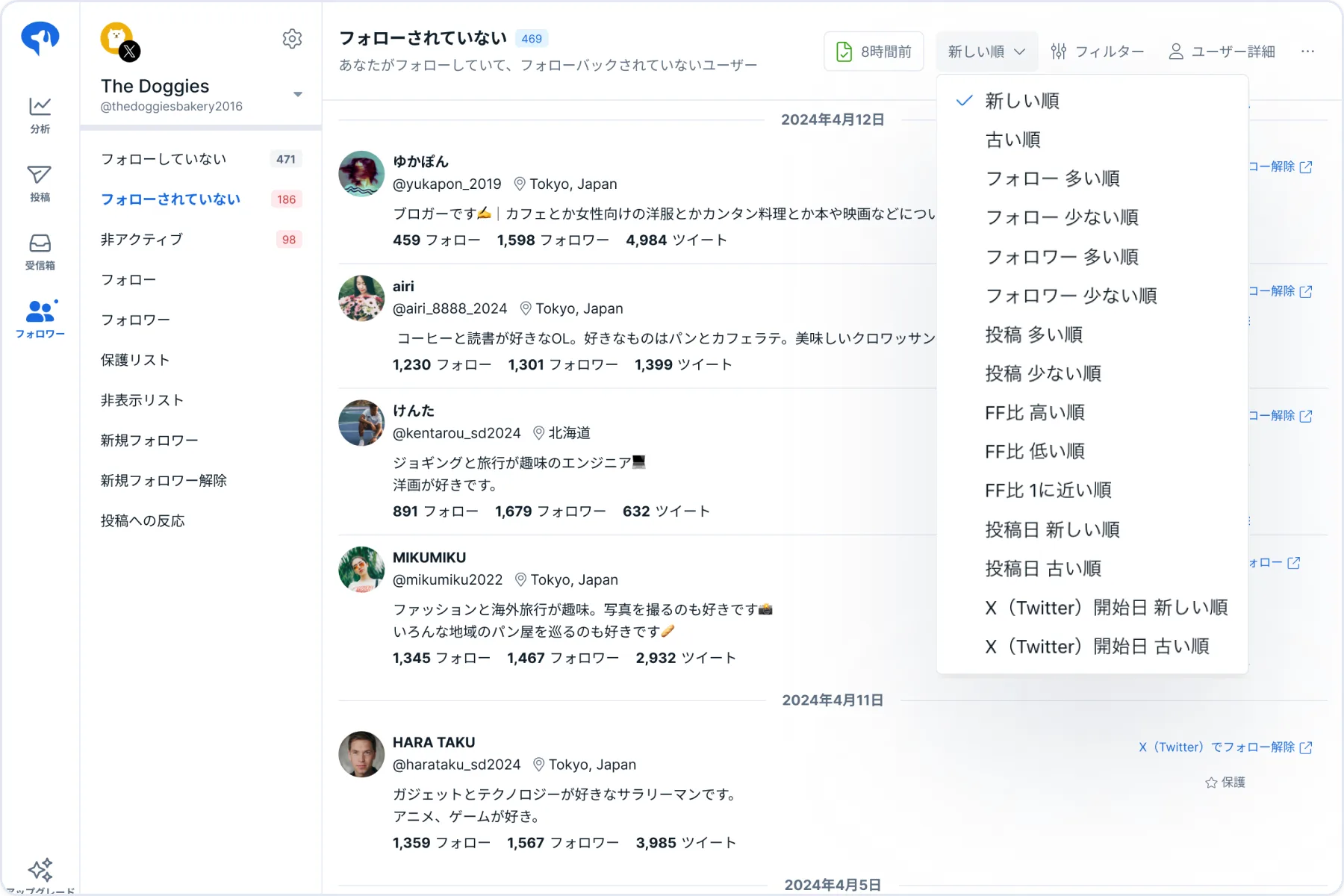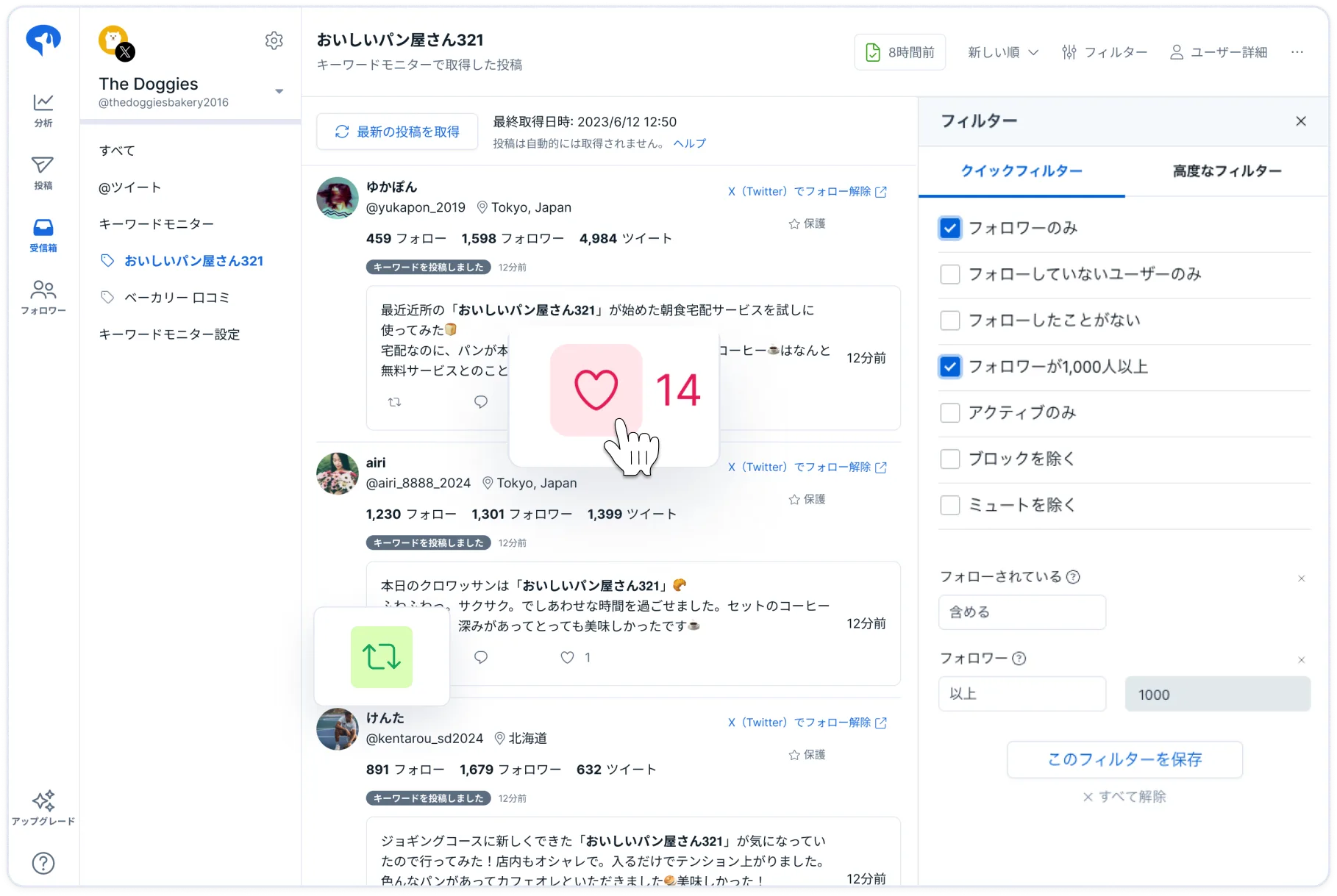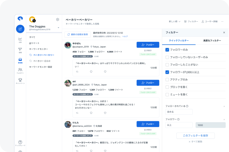 さまざまな種類のフィルターや並べ替え機能で、フォロワーと効率的にきめ細やかなコミュニケーションができます。